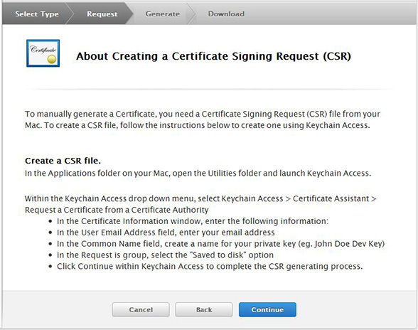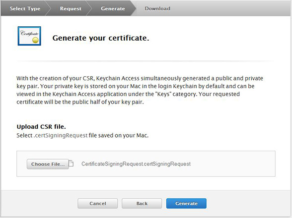 After you click Continue, you will be asked to upload the Certificate Signing Request you generate from the first step of this tutorial. Simply upload it and click generate.
