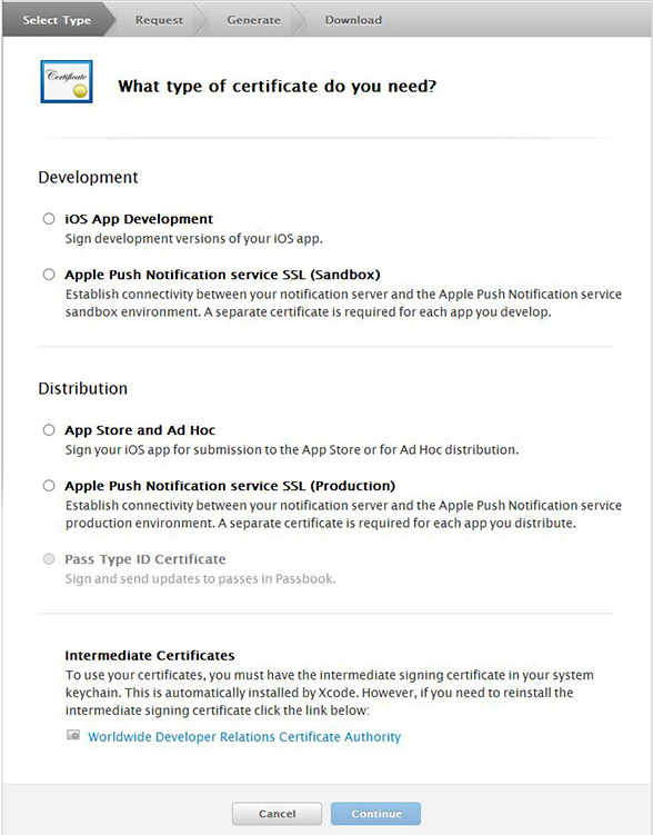 In the next screen you will need to select what type of certificate you are going to create, in this example we will be choosing the option "App Store and Ad Hoc"