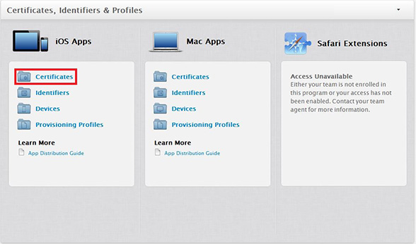 Now go back to Apple Developer Center and click "Certificates, Identifiers & Profiles".