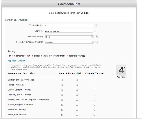 Next you will be brought to the page where you have to provide detail about your App, like version number, copyright, screenshots, contact info, etc. Fill it all in and hit "Continue".