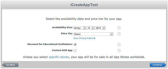 Next you can select when you want your app made available and the price you want to sell your app at. Select "Continue" when you are ready.