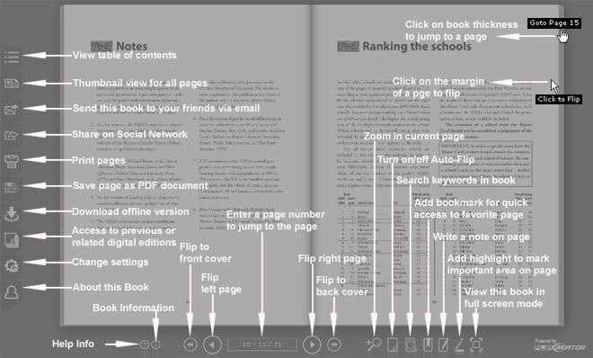 FlipCreator is a professional e-publishing solution that allows you read the digital publication as you are reading a real book. The following image shows all the features of a e-publication created by FlipCreator. Features of a digital publication depend on the contents of the publication. You may not see some of the features due to the digital rights managed by the publishers.